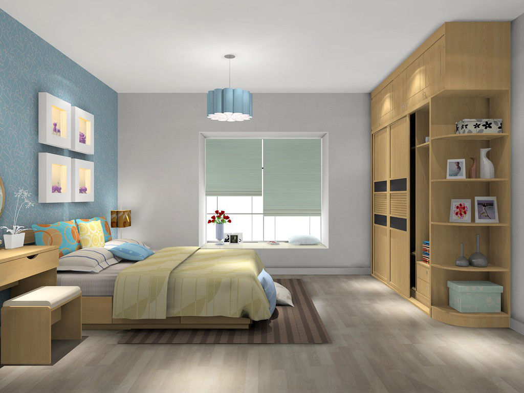 灰色墻面搭配原木色床飾,